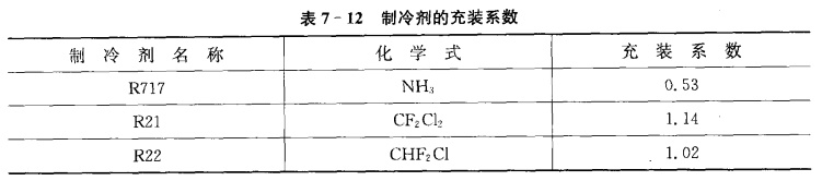 ①制冷劑的充裝數(shù)量,可按鋼瓶標(biāo)定值,也可按下表7-12的規(guī)定。實(shí)際充裝量為鋼瓶容量乘以充裝系數(shù)。