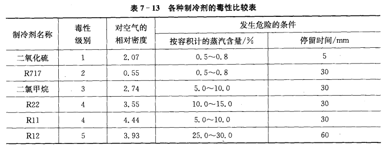制冷劑毒性比較見表7-13,按其對人體毒性和危險的大小進行排列。