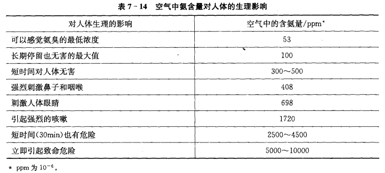 空氣中的含氨量對人體生理影響見表7-14。