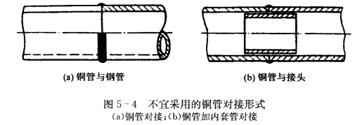 相同直徑紫銅管的對焊,應采用插入焊的結構形式。紫鋼管的一端用鋼沖模沖成擴口,將接頭部分內外表面用砂布擦亮,并插入擴口內壓緊,以免焊接時焊料從間隙流進管內,焊接時最好將管子垂直安放。同管徑對接時,不宜采用如圖5-4所示的焊接方式,因紫銅管壁薄,難保證焊接質量。