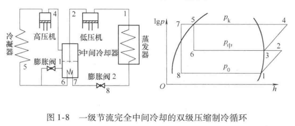 1、一級節流中間完全冷卻的雙級壓縮制冷循環