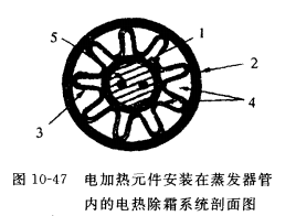 還有另一種電加熱器除霜系統(tǒng)是帶有雙管蒸發(fā)器。正常冷凍循環(huán)時(shí),蒸發(fā)器制冷劑流經(jīng)管問通道。電加熱元件插在中心管。在除霜過程中,制冷系統(tǒng)停止工作,電加熱元件通電,見圖10-47所示。于是,蒸發(fā)器管致使從內(nèi)部加熱除霜。
