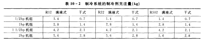 制冷劑充注瓶內制冷劑表面上的高壓迫使制冷劑流入系統。液體流入高壓側時會發生水流聲。如果響聲突然停止,說明充注瓶已空。只有當系統中的制冷劑全被抽空時才能用這種辦法充注,對于不同機組,表10-2給出充加到系統中制冷劑數量大概應為多少。
