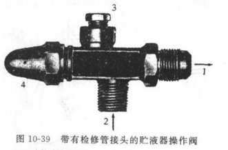 ②還有一種給系統充注液態制冷劑的方法是利用貯液器的操作閥一一如果該閥是青島三通閥, 見圖10-39,把充注瓶接到操作閥開口,吹掃管線,把充注瓶倒冒,打開充注上瓶上的閥門 ,再把貯液器操作閥 (主閥)擰幾圈,液態制冷劑就會流入貯液器和液管, 見圖10-40。