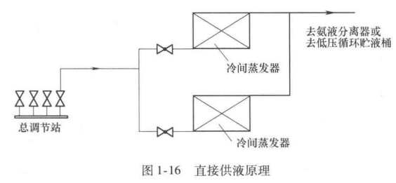 在制冷系統中,液體制冷劑從貯液器經過膨脹閥節流降壓后直接供給蒸發器。構成如下循環:節流閥→蒸發器→氨液分離器→壓縮機→油分離器→蒸發式冷凝器→貯液器→節流閥。這種供液方式稱為直接膨脹供液系統。這種系統的節流閥一般采用手動膨脹閥或熱力膨脹閥。直接供液原理如圖1-16所示