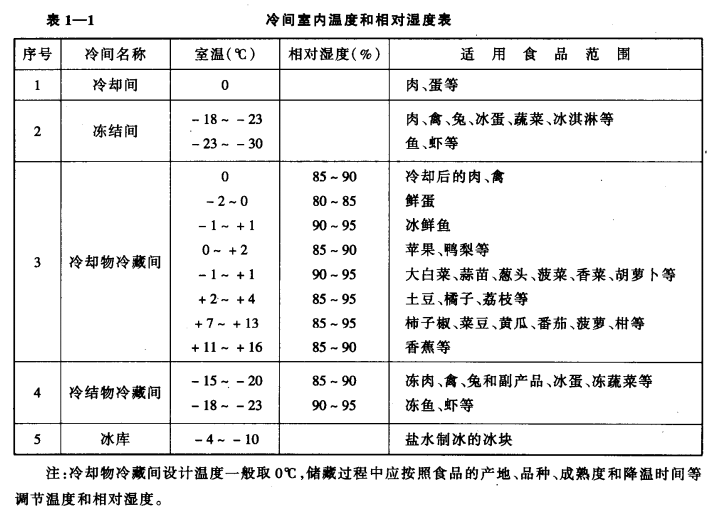 室內(nèi)計(jì)算溫度和濕度是根據(jù)食品加工工藝和食品貯存所需要的溫度和濕度進(jìn)行確定的。可按表1-1進(jìn)行選用。