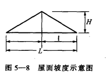 冷庫(kù)屋頂受水的影響比冷庫(kù)其他部位大。因此,冷庫(kù)的屋頂除有一定坡度外,尚需做防水處理。決定屋頂坡度的主要因素是屋頂材料的透水性和嚴(yán)密性程度。屋頂坡度表示方法有兩種:小坡屋頂常用H與1的百分比表示,大坡屋頂通常用H/L即高跨比來(lái)表示。見(jiàn)圖5-8。冷庫(kù)屋面坡度見(jiàn)表5-6。