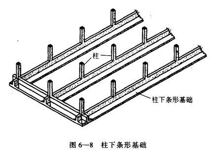 ①柱下條形基礎。當荷載較大、地墓較軟,所需各單獨基礎的底面積很大,各個基礎非常接近,以致基礎之間距離很小。這時,就可將各個單獨基礎連接起來,即成為柱下條形基礎。如圖6-8所示。