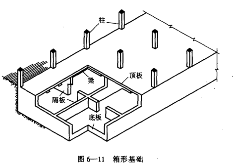 ④箱形基礎。這種基礎是由頂板、底板和縱橫交叉的隔板所組成。板的厚度由計算而定。箱形基礎具有很大的剛性,因此,不致由于地基不均勻變形而使上部結構產生較大的彎曲而造成開裂。其構造如圖6-11所示。