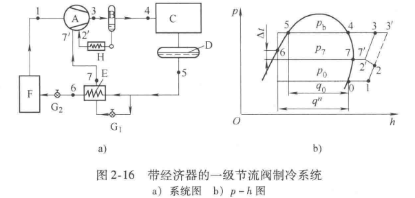 圖2-16a所示為帶經濟器的一級節流制冷系統。來自貯液器D的制冷劑液體分為兩支;一小支流經過節流閥G1降壓,到經濟器E中吸熱而產生閃發性氣體,經中間補氣口進入正處在壓縮初始階段的基元容積中,與原有氣體混合繼續被壓縮;另一主流流過經濟器E中的盤形管放熱而過冷,然后經節流閥G2節流進入蒸發器F中制冷。進入蒸發器的主流制冷劑液體只經一次節流,且節前與進入補氣口的氣體存在溫差△t。系統的壓-焓(即P-h)圖如圖2-16b所示。