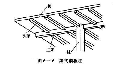(1)梁式樓板柱。柱的頂端支承主梁,主梁支承次梁,次梁支承樓板,荷載由主梁傳給柱子。見圖6-16。