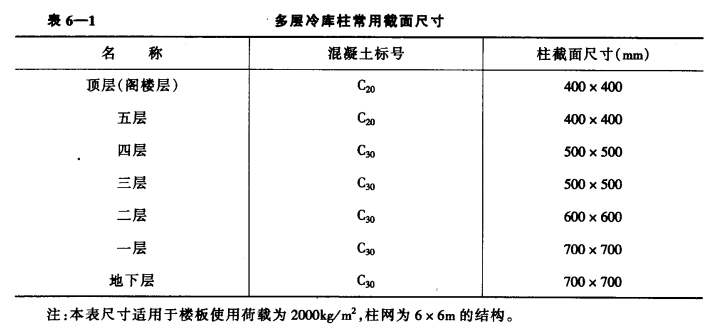 無梁樓板柱的斷面尺寸根據(jù)冷庫的層數(shù)、荷載的大小由計(jì)算決定。常用的柱截面尺寸有:400x400毫米、500x5oo毫米、600x600毫米、700x700毫米等。以柱子受力情況來看,每層柱子的荷載都不一樣,柱子的斷面尺寸亦應(yīng)不同。但為了設(shè)計(jì)和施工方便,一個(gè)多層冷庫的柱子只用一種或兩種斷面尺寸,而采用不同的混凝土標(biāo)號和配筋加以調(diào)整。多層冷庫柱子常用的截面見表6-1。
