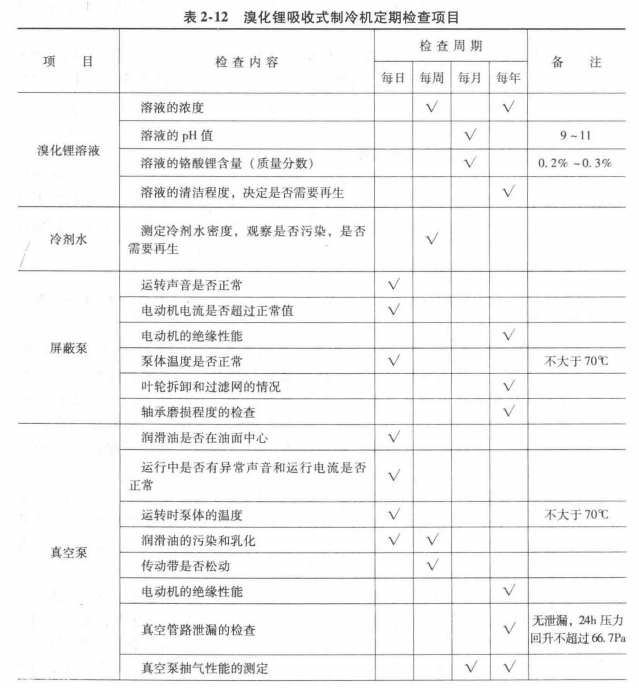 (1) 定期檢查 在溴化鋰吸收式制冷機運行期間,為了確保機組安全運行,應進行定期檢查。定期檢查的項目見表2-12。