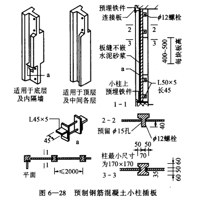 圖6-27中磚內襯墻,墻內設間距為3米的預制鋼筋混凝土小柱。小柱上端伸出鋼筋,搗固在地面翻起的防水線頂面,小柱沿高度每隔一米預留2?6鋼筋以便與磚內襯墻內的水平鋼筋拉結。這種磚內襯墻做法,由于磚的抗凍性較差,加上有時施工質最差,使用不久,易發生墻面抹灰大面積脫落的情況,因而這種磚內襯墻的做法已逐漸被淘汰,多數冷庫的設計都已采用了鋼筋混凝土插板墻。圖6-28為鋼筋混凝土小柱插板內襯墻。混凝土小柱焊牢于樓板底和地面翻起的防水線頂面,管道穿過的地方可將混凝土插板改為木板,便于施工。預制混凝土小柱插板內襯墻具有自重輕、拆裝方便、便于維修和抗凍性好等優點。