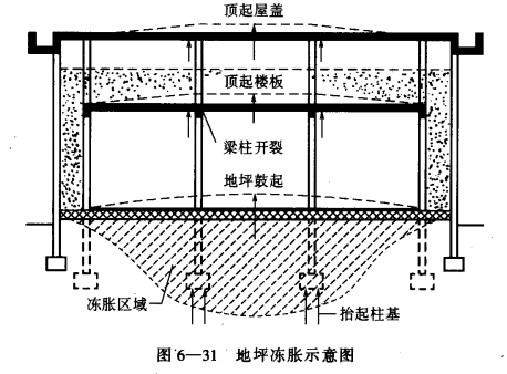 冷庫地坪雖然敷設了厚度與庫溫相適應的隔熱層,但并不能完全隔絕熱量的傳遞,只能降低熱量傳遞的速度。當0℃等溫線越過隔熱層侵入土壤后,便會引起土坡中水分的凍結。低溫冷藏庫地坪下土坡的凍結情況,一般靠近外墻的凍結深度淺,越深入到庫房中間,凍結深度就越深,其凍結范圍近似倒置的她物線形。參見圖6-31。同時,凍結深度會隨著時間和冷庫平面的增大而加深和加寬。當土壤凍結深度超過基礎時,它會把基礎抬起,造成冷庫上部結構的破壞。