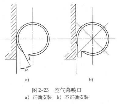 目前發現有不少冷庫的空氣幕噴口是向下垂直安裝的,此種安裝不正確。空氣幕的角度安裝調整是保證空氣幕使用效果的關鍵,如圖2-23所示。