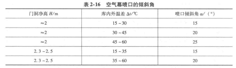安裝空氣幕時要保證噴風口與門框有適當的傾斜夾角。不能垂直安裝,傾斜夾角不宜過大也不宜過小。過大時,空氣幕噴風引向庫外的冷量多,射流就會遠離門榜,使門邊漏出冷空氣;夾角過小時,則引入庫內的空氣量多,回流區大,進入庫內的熱量和水分也多,空氣幕安裝時,傾斜角一般以夏季溫差為準,不同情況下空氣幕噴口斜角見表2-16。
