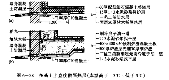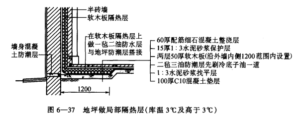 高溫庫系指庫溫在0℃及0℃以上的庫房。這類庫房一般不出現地坪凍脹問題。其地坪一般僅需在靠外墻的局部做隔熱層,其余范圍內只做普通地坪。參看圖6-37及圖6-38。