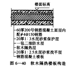 隔熱樓板一般由承重樓板層、防潮隔汽層、隔熱層和面層組成。其構造見圖6-39。
