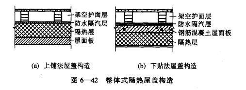 根據(jù)隔熱層的鋪設(shè)位置,這種屋蓋構(gòu)造可分為上鋪法與下貼法兩種,如圖6-42所示。
