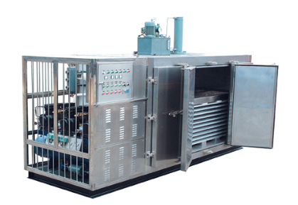 平板凍結器是一種接觸式凍結裝置,它專門用于凍結各種肉類和食品。凍結器的工作原理是將食品放入平板之間的空隙平面內,通過平板內部氨液的蒸發吸熱,使食品降溫凍結。平板凍結器一般由鋁合金材料制成。該裝置與普通凍結間的無縫鋼管相比,具有傳熱系數大、占地面積小、食品凍結干耗低、產品質量好、能耗僅為送風凍結裝置的70%、可以在常溫車間進行生產和維修簡便等優點。它的缺點是不適于凍結形狀不規則、厚度較大和不能擠壓的食品,只能凍結一種厚度的產品,并且產品容易變形,不便于機械化和和自動化操作。