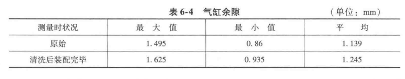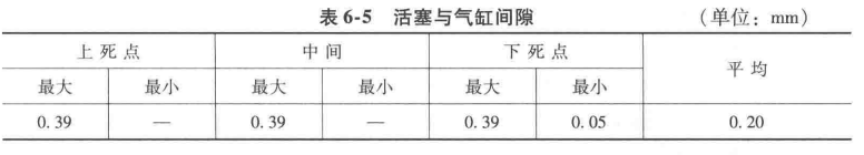 5)活塞與汽缸間隙(要求上部0.37~0.49mm,下部0.28~0.36mm),用塞尺測量氣缸與活塞的間隙,氣缸測上死點(diǎn)、下死點(diǎn)和中間三點(diǎn),活塞測上下左右死點(diǎn),結(jié)果見表6-5。