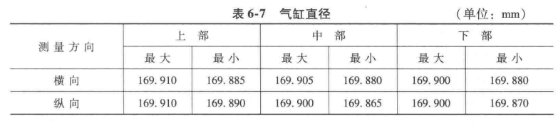 7)氣缸直徑,用內(nèi)徑千分表測量氣缸上中下三部分,每個部位也分橫向、縱向兩個尺寸,結(jié)果見表6-7。