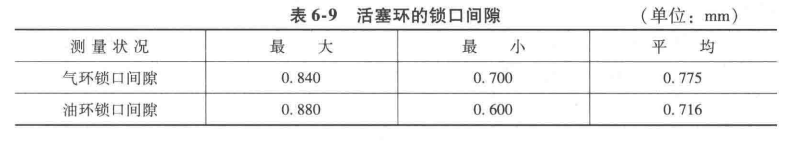 4)汽缸余隙(要求1~1.6mm),用套管代替彈簧,將安全蓋卡緊,在活塞頂部放置四根2.5mm熔絲(軟鉛絲),撥動聯(lián)軸器一圈后取出,用外徑千分尺測量,結(jié)果見表6-4。