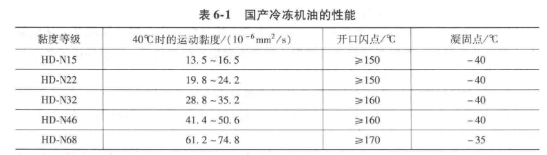 3)潤滑油的熱導率遠比金屬小,當油附著在管道熱交換器時,將會使傳熱惡化,引起冷凝溫度和冷凝壓力升高,系統蒸發壓力下降,并使壓縮機排氣溫度升高。這些都會導致制冷裝置運行時條件變壞,制冷效率降低,系統耗電增加。根據有關資料分析,若在冷凝器管壁面上附有0.1mm厚的油膜,則壓縮機制冷量將會降低16%;若在蒸發排管壁面上存有0.1mm的油層,將使系統中氨的蒸發溫度下降2.5℃,并且耗電增加11%~12%。為了避免和減少潤滑油進入系統,除了設置性能良好的油分離器外,在系統運行中還必須做到有計劃從設備中定期放油,如果發現壓縮機加油量增多,而放油量少于加入的油量,應檢查原因,增加放油次數,防止過多的油進入系統,保證設備的正常運行。國產冷凍機油的性能見表6-1。