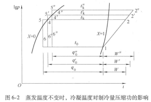 據資料介紹,在氨制冷系統中,如果冷凝溫度升高5℃,壓縮機的制冷量將減少7%,耗電量將增加10%。這種狀況運行是不經濟的。從圖6-2可以看出,q0>q’0>q’’0,W<W'<W",并且因冷凝壓力升高,潤滑油消耗增多,機器的運轉條件惡化,直接影響到制冷裝置的制冷效果、安全可靠性和耗能水平。因此在平常系統操作調整中,應盡量降低冷凝溫度和冷凝壓力,如圖6-2所示。