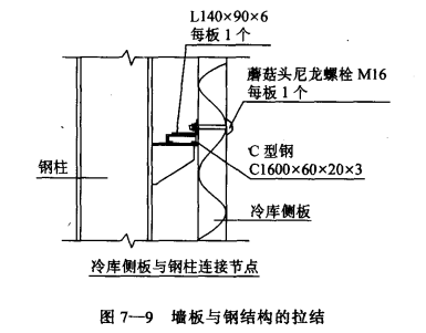 墻板與地面的拉結 將墻板吊裝于鋼結構框架橫梁的有關支架螺栓餃接固定,坡板底部與地面反梁上的預埋螺栓固定,并安裝堵外的散水板后,在墻板下端與地面絕緣(軟木瀝青油氈)之間的空間現場澆灌聚氨脂泡沫塑料進行連接(在澆灌前,于墻板下端空間的內側,用聚苯乙烯泡沫塑料塞填密實,并枯貼乙烯樹脂薄膜)。