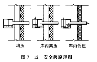 (三)安全閥 在氣調庫密閉后,保證庫內外壓力平衡的安全閥也是濟南恒溫氣調保鮮冷藏庫必不可少的特有安全設施。安全閥可以防止庫內產生過大的正壓和負壓,使圍護結構及其氣密層免遭破壞;安全閥是利用水封原理制成的,其原理如圖7-12所示。