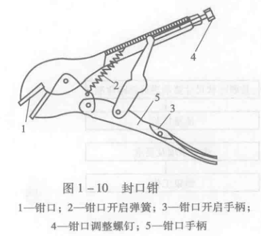 封口鉗也稱大力鉗,通常是用于電冰箱修復、試機正常后,封閉制冷系統工藝管的專用工具。封口鉗的結構如圖1-10所示。操作中首先要根據管壁的厚度調整鉗柄尾部的螺釘,使鉗口的間隙小于銅管壁厚的兩倍,其過大時封閉不嚴,過小時易將鋼管夾斷。調整適宜后將銅管夾于鉗口的中間,合掌用力緊握封口鉗的兩個手柄,鉗口便把銅管夾扁而銅管的內孔也隨即被側壁擠死,起到封閉的作用。封口后撥動開啟手柄,在開啟彈簧的作用下鉗口自動打開,其實物如圖1-11所示。