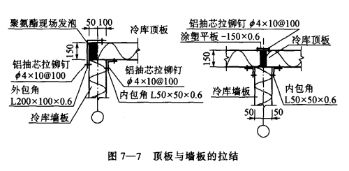 2.墻板與頂板交接處的氣密處理 頂板與墻板拼接時,留出50毫米寬的預留槽,頂板全部定位后,用聚氨酯現場發泡填充密實預槽,然后用鍍鋅涂塑鋼板封面,最后對接縫表面處進行氣密處理,參見圖7-7。