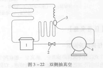 所謂雙側抽真空就是在高、低壓側同時進行抽真空操作,主要是為了克服低壓側抽真空對高壓側真空度的影響,其管道的連接如圖3-22所示。在雙尾干燥過濾器的工藝管上焊接帶有真空壓力表的修理閥,讓其與壓縮機殼上的工藝管并連在同一臺真空泵上,同時進行抽真空,當表壓降至-0.1MPa時,先用封口鉗將干燥過濾器上的工藝管封死,再關閉修理閥,然后繼續抽真空,30~60min后,即可結束抽真空操作。雙側抽真空縮短了操作時間且提高了系統的真空度,但焊點增多,工藝要求高,操作也比較復雜。