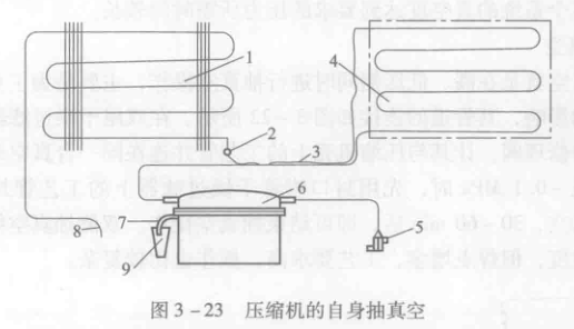 當(dāng)沒有真空泵時,為應(yīng)急可采用該方法進(jìn)行抽真空操作。其基本原理是:利用壓縮機(jī)自身運(yùn)轉(zhuǎn),吸收制冷系統(tǒng)中的氣體,然后再壓縮排到外界,如圖3-23所示。將壓縮機(jī)高壓排氣管與冷凝器隔開,并在排氣管上接一根橡膠軟管,使其與水杯9相連,把冷凝器入口端再套上一根橡膠管(封口用)。關(guān)閉修理閥,啟動壓縮機(jī),則系統(tǒng)內(nèi)的氣體從排氣管中便被排出。剛被排出的氣體在水杯中會沖出水泡,但隨著壓縮機(jī)運(yùn)轉(zhuǎn)時間加長,系統(tǒng)內(nèi)的氣體會逐漸減少,當(dāng)水杯中無氣泡時,把制冷劑鋼瓶與修理閥連接起立,再微開修理閥,向制冷系統(tǒng)內(nèi)充人少量制冷劑。當(dāng)水杯中又一次出現(xiàn)氣泡時,可封閉排氣口軟管,同時停止壓縮機(jī)的運(yùn)行。全部打開制冷劑鋼瓶和修理閥門,繼續(xù)向系統(tǒng)內(nèi)充注制冷劑,觀察冷凝器管口橡膠管的變化,若開始慢慢膨脹,則應(yīng)立即停止充氣,隨即迅速拆下冷凝器和壓縮機(jī)管口上的橡膠管,并立刻將其焊接好。