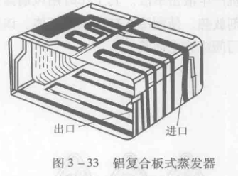 鋁復(fù)合板式蒸發(fā)器結(jié)構(gòu)如圖3-33所示,它分為鋁鋅鋁復(fù)合板吹脹型與鋁板印刷管道型兩種類型。鋁鋅鋁復(fù)合板裁好后,裝到刻有制冷劑管道的模具上,經(jīng)加壓、加熱,使復(fù)合板中間的鋅熔化,同時(shí)用高壓氮?dú)鈱⒖逃泄艿赖牟糠执得洺晒苄巍H缓筮M(jìn)行抽真空,無(wú)管道處的鋅層重新與鋁板粘合,即形成蒸發(fā)器板坯。板坯焊上制冷劑進(jìn)、出管,并彎成“口”字形,最后經(jīng)鋁陽(yáng)極氧化處理,就制成鋁鋅鋁復(fù)合板吹脹形蒸發(fā)器。這種蒸發(fā)器由于鋅的存在,易產(chǎn)生腐蝕穿孔,維修率較高。鋁板印刷管道形蒸發(fā)器是用絲網(wǎng)將焊劑石墨按蒸發(fā)器管路的設(shè)計(jì)印在一塊鋁板上,與另一塊無(wú)印刷管路的鋁板研壓成復(fù)合板。然后用高壓氮?dú)鈱⒂∷⒐苈反得洠賹⒋得浐蟮膹?fù)合板麻曲成形,即成為鋁板印刷管道吹脹形蒸發(fā)器。這種蒸發(fā)器耐腐蝕,制冷效果好,結(jié)構(gòu)為單一的整體,廣泛應(yīng)用于直冷式單門電冰箱中。