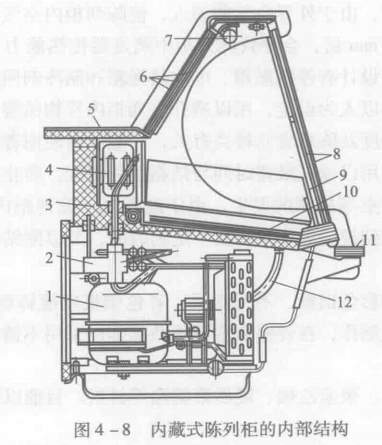 內藏式陳列柜的內部結構如圖4-8所示,壓縮機多為封閉式,冷凝器采用強制通風冷凝器,壓縮機和冷凝器一般置于柜體底部,為防止灰塵堵塞冷凝器、保證冷凝器的冷卻效果,在冷凝器前設置了空氣過濾器。分體式陳列柜的內部結構如圖4-9所示,其壓縮機多采用半封閉式,一般為多臺壓縮機并聯成機組形式,可同時為多臺陳列柜提供冷量,以便于制冷量的調節,使設備效率得以大幅提高、運行管理費用得以大幅降低。
