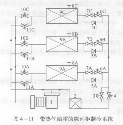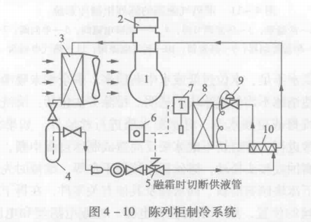 3、必須設(shè)融霜機(jī)構(gòu):融霜主要有電熱融霜與熱氣融霜兩種方式。電熱融霜的方法簡便、易行,熱氣融霜具有快速、節(jié)能、柜內(nèi)溫度波動小等優(yōu)點(diǎn),但系統(tǒng)較復(fù)雜。圖4-10、圖4-11所示為陳列柜制冷系統(tǒng)示意圖,如圖4-10所示適于電熱融霜,如圖4-11所示適于熱氣融霜。