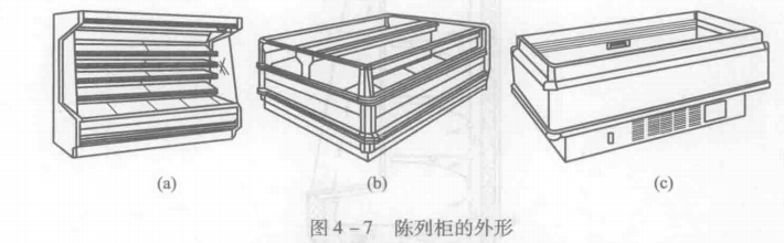 (3)平式陳列柜(常以符號了表示):結構上類似于島式,其中有一個立面靠墻,一般結構較小,采用內藏式獨立制冷機組吹風冷卻供冷。平式陳列柜陳列面與地面平行,柜體低于人體高度,一般從上面取貨,圖4-7(e)所示為平式陳列柜的外形。