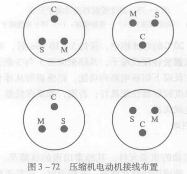 (1)直流電阻測量法:壓縮機機殼接線柱分別為運行繞組一端M、啟動繞組一端$及它們的公共端C,三個接線柱為等邊三角形,如圖3-72所示。用萬用表的電阻擋分別測量每兩個接線柱之間的直流電阻,可得三個電阻值,最大阻值應等于其余兩個阻值之和,且最大阻值的兩端為運轉繞組端和啟動繞組端,另一端為它們的公共端。若上述電阻值不符合其和或差值關系,則電動機必有故障;若符合差或和值關系,則應再測量接線柱與壓縮機外殼的絕緣電阻(應大于2MO)是否滿足要求。