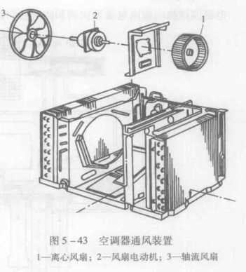 空調器的通風裝置主要部件有室內側的離心風扇、室外側的排風軸流風扇及送風百葉、風向調節閥板、回風格柵等,空調器的通風裝置如圖5-43所示。