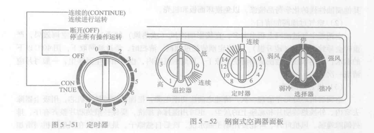 窗式空調有臥式和豎式之分,而臥式空調器又有單冷型和冷熱兩用型,因此其使用方法略有不同。單冷型空調器的控制面板上有溫度自動調節旋鈕和選擇開關,供用戶操作使用,選擇開關上面刻度有低風、高風、低冷、高冷和關(OFF)等。冷熱兩用型空調器雖有熱泵型和電熱型的分別,但其操作控制面板無明顯的區別,均有選擇器、溫度調節旋鈕及通風開關等,單冷型和冷熱兩用型空調器的操作面板如圖5-50所示。有的空調器上裝有定時器,如圖5-51所示,此定時器上有0~10h的定時擋次和連續運轉擋,使用定時器可自動控制空調器的運轉時間。鋼窗式(豎式)空調器體積較小,制冷量在2500W以內,所以只有單冷機使用比較方便,這種空調器的操作面板如圖5-52所示,上面有選擇器、定時器和溫度調節器。