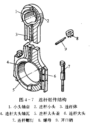 濟南壓縮機的連桿組件結構如圖4-7所示,它由連桿體、連桿大頭蓋、連桿大頭軸瓦、小頭襯套和連桿螺栓、螺母等組成。連桿小頭及其襯套通過活塞銷連接,并隨活塞一起在汽缸中作往復運動。連桿大頭及大頭軸瓦與軸柄銷連接。隨曲軸一起在曲軸箱內做旋轉運動。