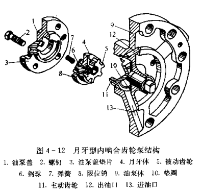 月牙型內嚙合齒輪泵的特點是,在月牙體背面有一個定位凸面,卡在泵蓋上的半圓周槽內,使月牙體只能移動半圈,當軸體反向轉動時,月牙體轉過180°,被動齒輪的軸心位置也轉過180°。因此,無論主動齒輪正轉或反轉,它都能泵油。