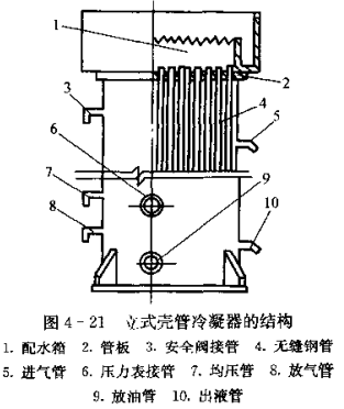另外,在冷凝器的主體上還設有進氣管、排氣管、壓力表、安全閥等管道接頭,接通相應的管道與設備。為了避免液體中混入的潤滑油而影響制冷,出液管接頭距筒底應有規(guī)定的距離,積存在筒底的潤滑油可通過底部的放油閥放出。