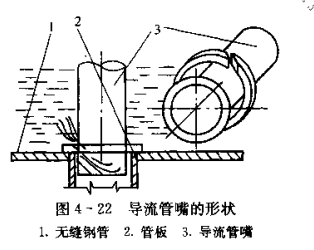 立式殼管冷凝器的結構如圖4-21所示。它是鋼板卷焊而成的圓筒,簡的上下兩端各焊一塊鋼板,兩鋼板之間焊接有許多根?38 X3 mm或?51X3.5mm的無縫鋼管,冷凝器安裝在一個混凝土水池上,冷凝器頂部安裝有一個配水箱,通過導流管嘴將冷卻水均勻地分配到冷卻塔內的每根鋼管內。導流管嘴的形狀如圖4-22所示。冷卻水在管內吸熱后,從冷凝器下部排入蓄水池。