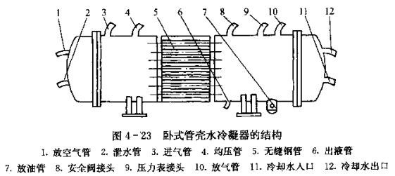 工作時,冷卻水由水泵帶動,從端蓋下部進(jìn)水管流人冷凝器,因端蓋鑄有分水槽,使冷水在筒內(nèi)分成幾個流程,自下而上在冷卻水管內(nèi)按順序反復(fù)流動,最后由端蓋上部的出水管流出。高溫高壓氣體制冷劑由管殼頂部進(jìn)氣管進(jìn)入殼體內(nèi)的空隙之間,遇冷后便結(jié)成液滴,下落到殼體的底部,再由底部的出液管放出。