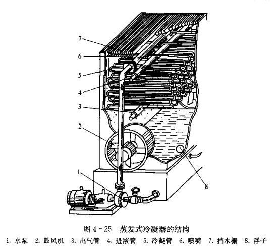 蒸發式冷凝器的結構如圖4-25所示。它為一個薄鋼板箱體,箱內裝設幾組翅片管或蛇形管,箱體的頂部或側面裝有風機,在管組上配有噴水裝置。蒸發器工作時,氨蒸汽從蛇形管的上部進入,噴水裝置對蛇形管外壁噴水,使管上的水迅速蒸發,由于風機強力通風,將管內氨蒸汽冷凝所放出的熱量被水的蒸發和流動的空氣帶走,管內的氣體氨蒸汽冷凝后變成液體從下部流出。