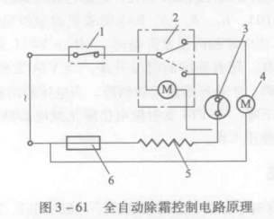 全自動(dòng)除霜裝置的工作原理如圖3-61所示。圖3-61中所示為除霜定時(shí)器的活動(dòng)觸點(diǎn)與壓縮機(jī)接通時(shí)的狀態(tài)。當(dāng)壓縮機(jī)運(yùn)轉(zhuǎn)并進(jìn)行制冷循環(huán)時(shí),設(shè)定的除霜定時(shí)器與壓縮機(jī)同步開始計(jì)時(shí)。當(dāng)同步運(yùn)轉(zhuǎn)達(dá)到設(shè)定的除霜間隔時(shí)間8h時(shí),除霜計(jì)時(shí)器的活動(dòng)觸點(diǎn)切換,將壓縮機(jī)電動(dòng)機(jī)電路斷開,并接通由雙金屬除霜溫度控制器、除霜加熱器和除霜超熱保護(hù)器所組成的電路,對(duì)蒸發(fā)器加熱除霜,這時(shí)除霜定時(shí)器不工作。霜層全部融化完后,蒸發(fā)器表面溫度還會(huì)繼續(xù)升高,當(dāng)溫度達(dá)到雙金屬除霜溫控器跳開溫度(一般為13℃+3℃)時(shí),觸點(diǎn)跳開,切斷除霜加熱器電路,停止加熱,除霜定時(shí)器又開始工作,經(jīng)約2min后定時(shí)器觸點(diǎn)切換,將壓縮機(jī)電路接通,壓縮機(jī)又開始下一周期的運(yùn)轉(zhuǎn)。當(dāng)蒸發(fā)器表面溫度降低到雙金屬除霜溫控器復(fù)位溫度(一般設(shè)定最低溫度為-5℃)時(shí),觸點(diǎn)復(fù)位,并接通除霜加熱器電路,為下一次除霜做準(zhǔn)備,從而實(shí)現(xiàn)了對(duì)電冰箱的周期性全自動(dòng)除霜控制。